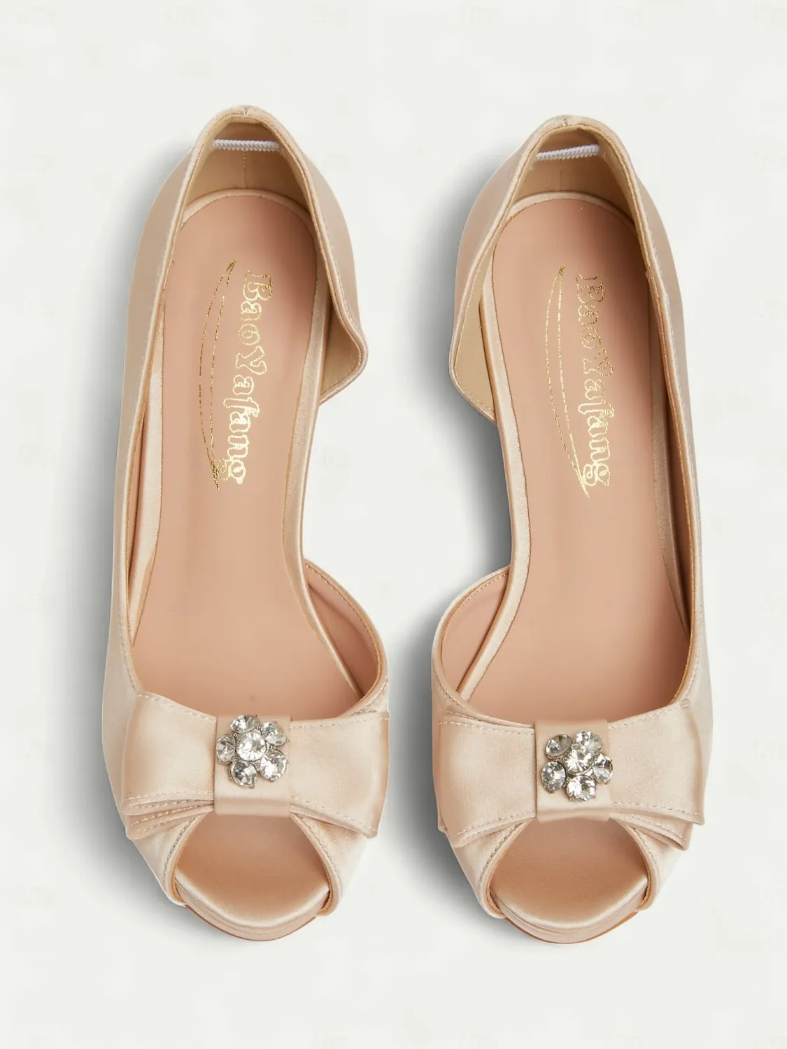 Women’s Champagne Satin Peep Toe Heels with Bow and Rhinestone – Elegant Mid Heel Pumps for Cocktail Parties and Formal Events