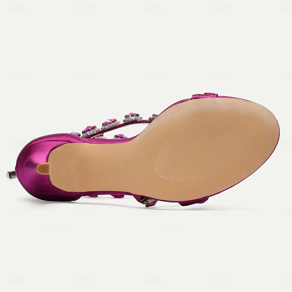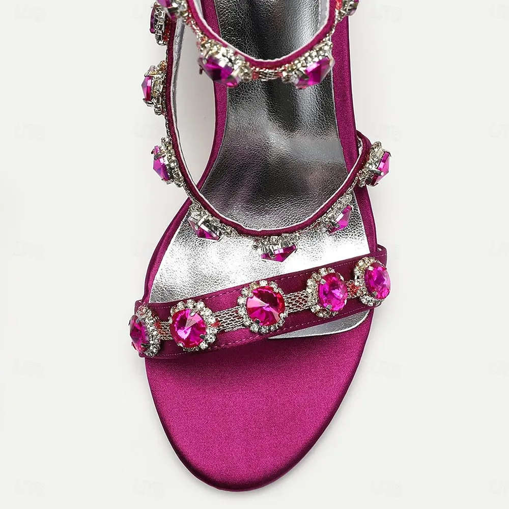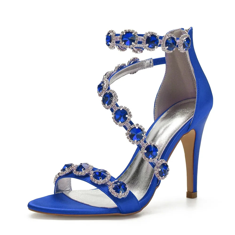 [Fabric]: Crafted from luxurious satin, these women’s bridal shoes offer a sophisticated sheen that captures attention. The satin material not only provides elegance but also ensures a comfortable wear for special occasions.[Design]: Featuring a modern open-toe silhouette paired with a stiletto high heel, these shoes offer both height and poise. The standout design includes an intricate strappy detail adorned with large emerald-green rhinestones, each encircled by smaller clear crystals, adding an opulent touch and a sparkling effect with every step. An elegant zipper closure at the back ensures a secure and stylish fit.[Design Highlights]: The ankle strap emphasizes chic style while offering security, making the shoes perfect for extended wear. The combination of rhinestone and crystal embellishments creates a dazzling appearance, ideal for glamorous events.[Occasions]: Ideal for formal events such as weddings, cocktail parties, and other special gatherings where making a stylish statement is key. These sandals’ rich color options and dazzling embellishments complement a range of outfits, particularly evening dresses and gowns.[Size]: Available in a wide range of sizes to fit different feet, from US5.5 to US10.5, ensuring a perfect fit for everyone seeking to add a touch of luxury to their look.OK