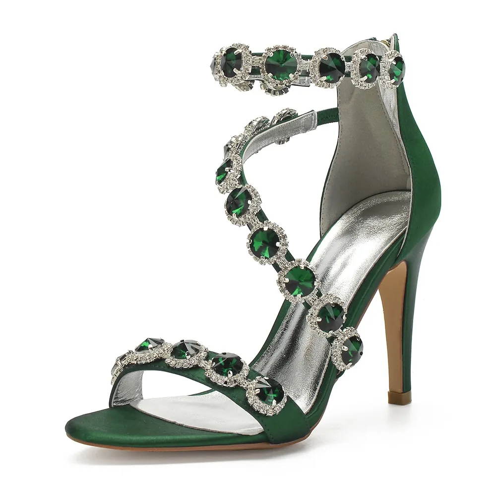 Women’s Green Rhinestone Strappy High Heel Sandals – Elegant Satin Stiletto Heels for Weddings, Prom, Cocktail Parties & Formal Events